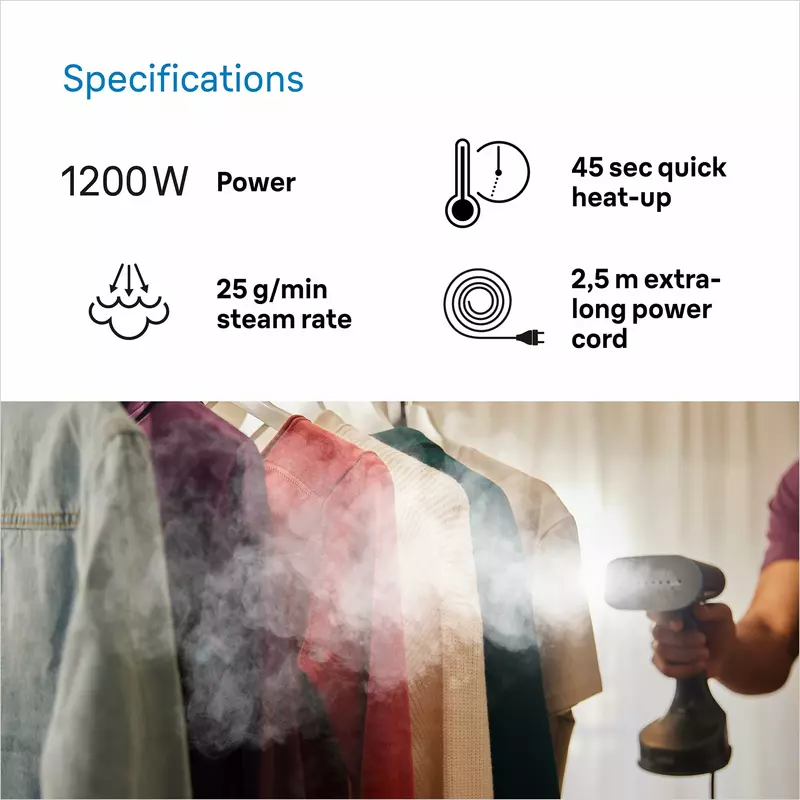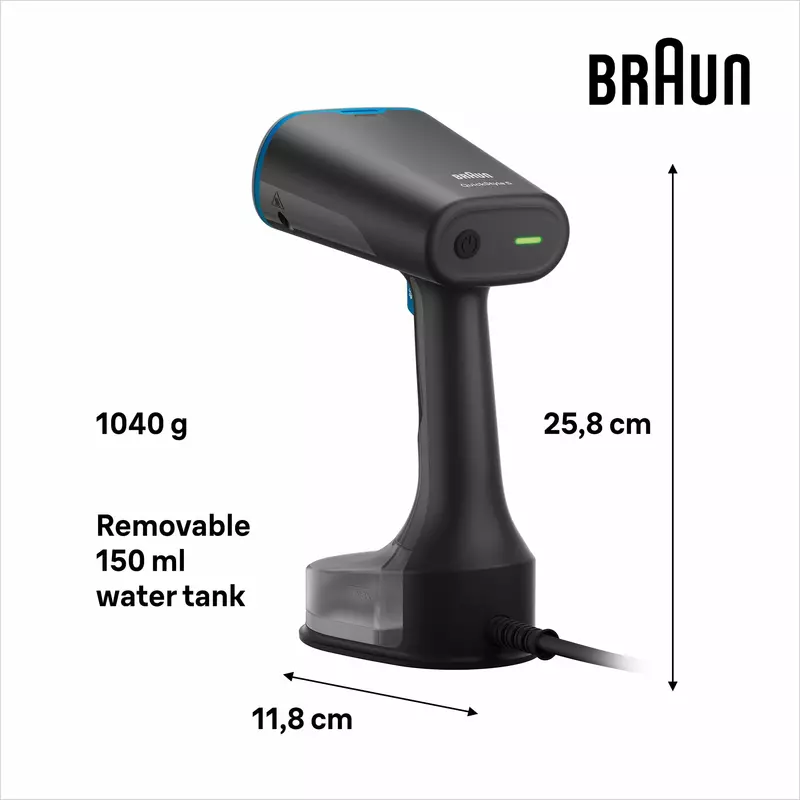 Braun Garment Steamer 150ML Tank Hand Held 1200W 13850000-GS5031BL Horizontal And Vertical Compact And Light Soleplate Removable Water Tank