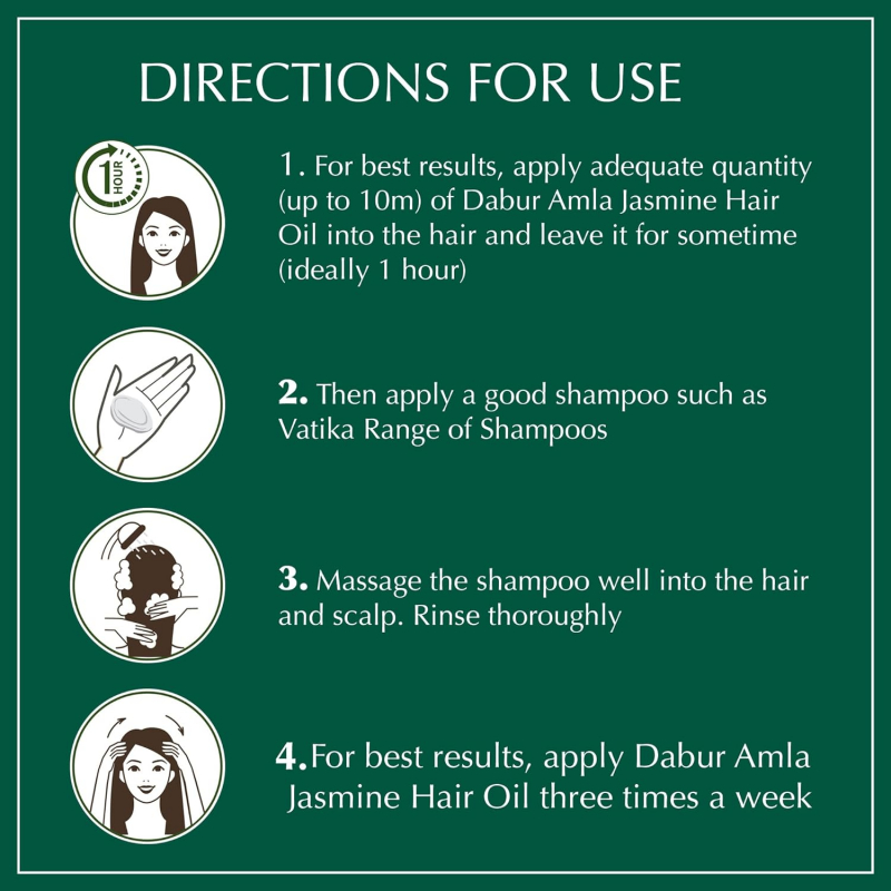 DIRECTIONS FOR USE: Use your fingertips to gently massage Dabur Amla Jasmine Hair Oil into the scalp and hair. The use of this amla hair oil on a regular basis helps to strengthen the hair and keep it shining longer.