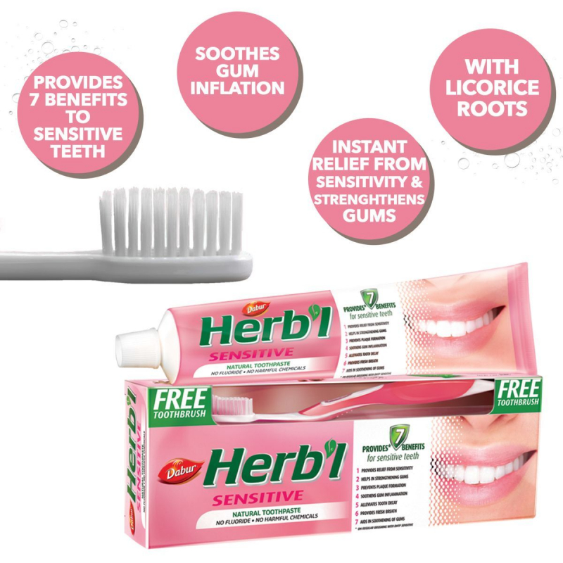 The Dabur Herb’l Sensitive toothpaste contains Licorice Root, which soothes gum inflammation and strengthens gums.