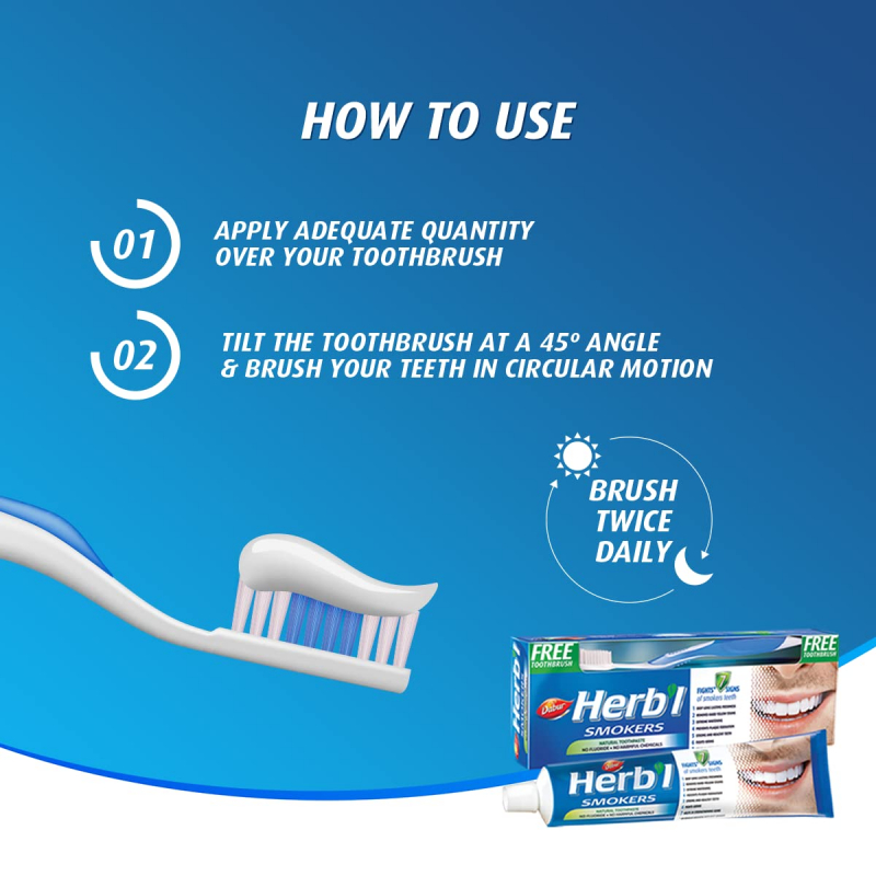 The Dabur Herbal Smokers Natural Toothpaste With The Unique Blend Of Salt, Milk And Blackberry Bark Has Over 130 Years Of Herbal Expertise. These Natural Ayurvedic Extracts In Your Smokers Toothpaste Protect Your Precious Smile With Its Fluoride Free Organic Toothpaste Formula With 0 Harmful Chemicals. The Dabur Smokers Natural Toothpaste Helps You Fight 7 Signs Of Yellow Stains In Smokers Teeth Including Plaque, Tarter, Germs Giving Out Long Lasting Freshness And Extreme Whitening. Whiten Your Teeth With Dabur Smokers Natural Toothpaste & Get A Toothbrush Absolutely Free! It’S Now Time To Bid Goodbye To Weak Oral Health!