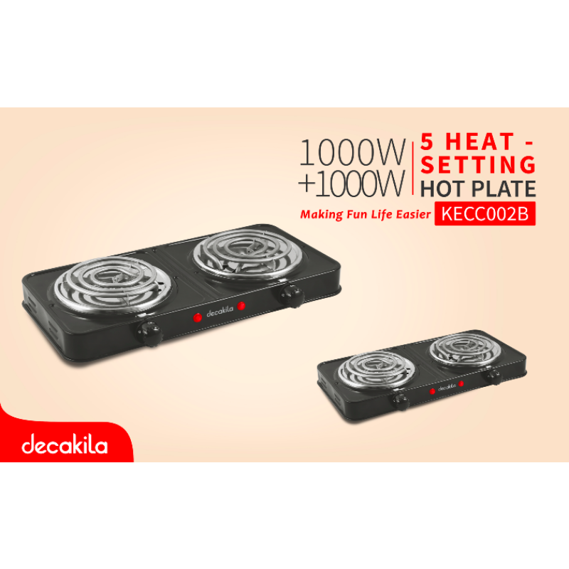 Decakila Coil Plate Double 2000W 2 Burner Plate 5 Heat Setting Stainless Burner Cap Light Indicator – Auto-Thermostat Control KECC002B