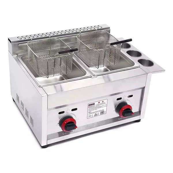 - NOTE – This fryer is heated by liquefied petroleum gas+ Low Pressure Gas Valve. Packing include: 1*gas fryer, 2*Frying Basket, 2*pot lids, 4*foot pads, 1*trachea, 1*screw pack. Low pressure gas valve need to be purchased separately by the customer, which is not included in this product.