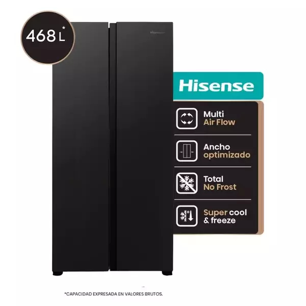 Hisense slim Side By Side Fridge 468L, Multi Air Flow, Total Noe Frost, Super Freeze Black RS3N428NAB