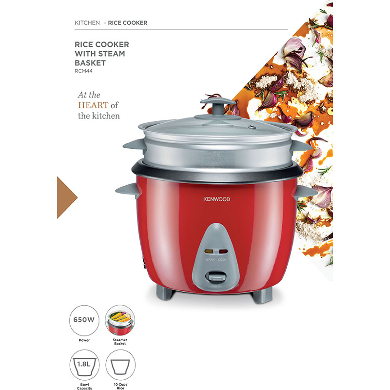 Kenwood 2-in-1 Rice Cooker 1.8L 10-Cups Rice with Food Steamer Basket Non-Stick Cooking Pot Temepered Glass Lid Warm/Cook Lights Spatula Holder Detachable Cord RCM44.000RD