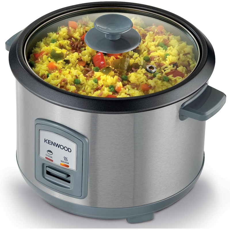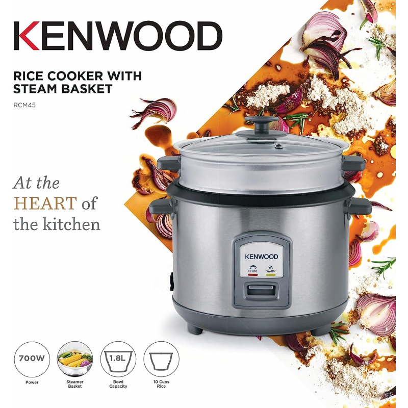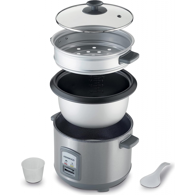 Large 1.8 liter capacity bowl with handy keep warm function- enough for cooking ten cups of rice Includes additional tray for steaming fish or vegetables Non-stick removable bowl Includes spatula and measuring cup Elegant and easy to clean with a glass lid, KENWOOD 2-in-1 Rice Cooker 1.8L 10-Cups Rice with Food Steamer Basket, Non-Stick Cooking Pot, Tempered Glass Lid, Warm/Cook Lights, Spatula Holder, Detachable Cord RCM45.000SS Silver.