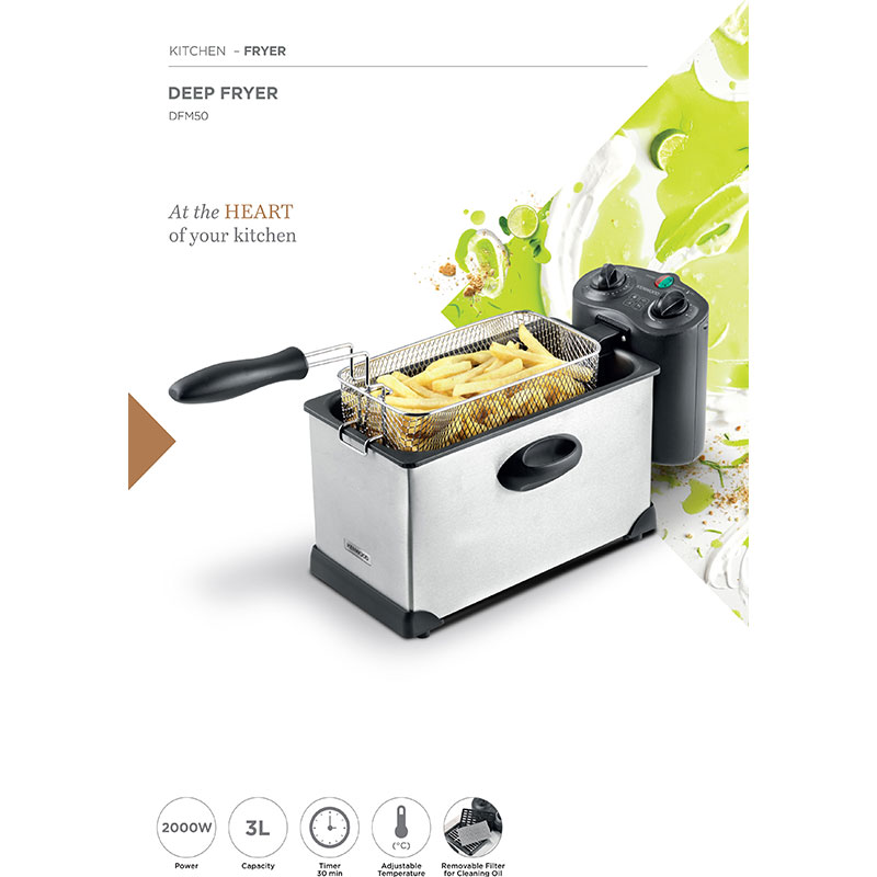 Kenwood Deep fryer 2000w, 3L capacity ideal for cooking French Fries, Onion Rings, Egg Rolls, Fried Chicken, Panko Shrimp and Any Other Deep Fried Food. This Stainless Steel Deep Fryer is Durable for Both Home and Commercial use. Easy to Operate and Clean. Package Includes: 1 Single Tank Deep Fryer 1, Stainless Steel Basket 1, Stainless Steel Lid 1, Installation Package, 1 Manual. Power 2000W 3L Capacity Timer 30 min Adjustable Thermostat for Oil Temperature Removable Filter & Oil Container Window View for checking Cooking Immersed Oil Heating Element Non-Slide Feet Enamel Coating Pan for Easy Cleaning.