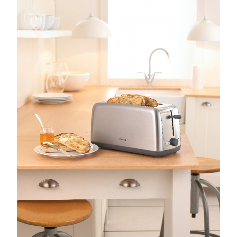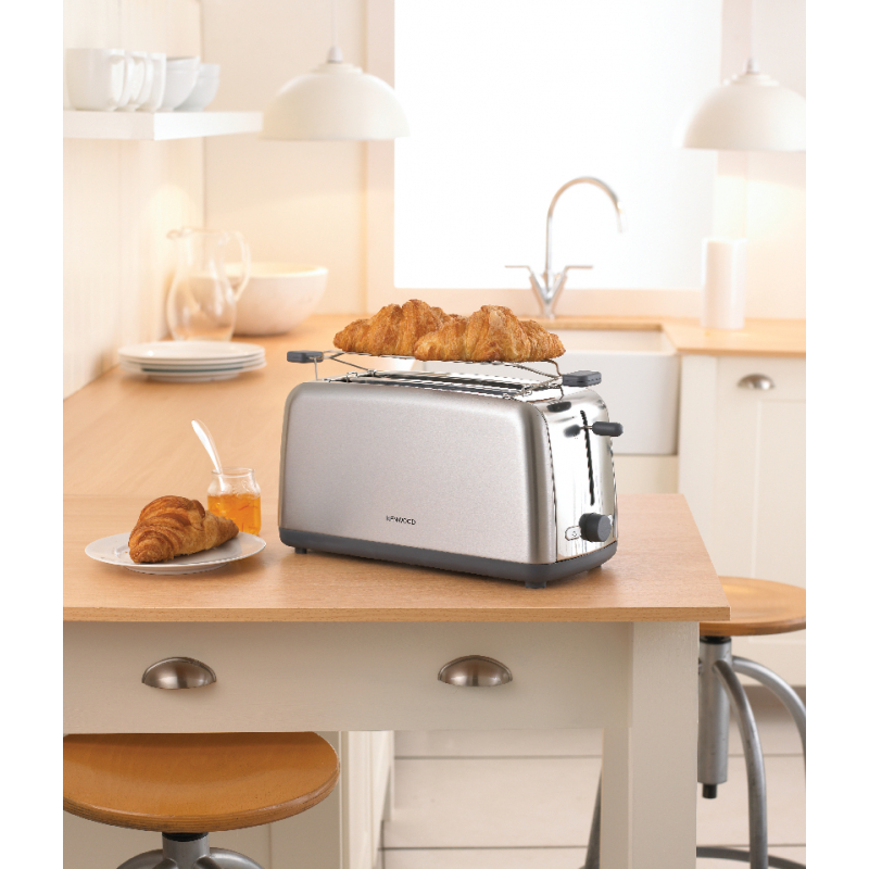 The Kenwood Scene Toaster is very easy and quick to use, contains 2 long slices to reheat the toasted bread, in addition, it has a pop up buns and bread warming rack, plus, a crumb tray to easily clean it, and you can also wrap the cord to adjust its length underneath the toaster.