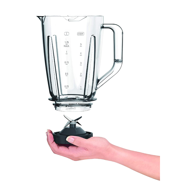 A 2 L total jar with 1.25 L of blending space and a measuring cup included for extra precision provides the ideal quantity for the entire family, perfect for both everyday use and when entertaining guests. A textured grip around the function dial, an ergonomic handle, and recessed controls ensure maximum comfort and ease-of-use with a clean, modern look, with three speeds to customize blending results