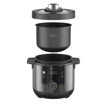Enjoy all your favorite meals in no time! Moulinex is a fast multicooker that produces delicious results up to 3x faster*, with a special design for meals that come out perfect every time. Moulinex exclusive spherical bowl offers a larger heating surface with optimal heat diffusion and circulation. The result is tender, juicy results day after day, for all the pleasure of home cooking with none of the hassle. Discover crowd-pleasing family meals from starter to dessert-with one appliance that serves as a pressure cooker, steam cooker, soup maker, and more-all at your fingertips and effortless to master with an intuitive single control knob. Choose from 10 automatic cooking programs plus manual control and experience the difference with the easy-to-use multicooker designed to meet all your cooking needs-for one great kitchen essential that replaces at least seven cooking appliances.