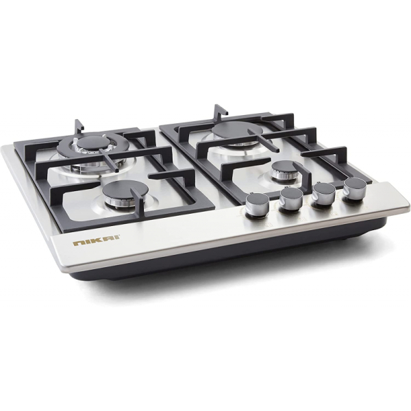 Nikai Gas Cooker 4 Burner Steel Built In Hob 50X45X25 NGH3005N Stainless Steel Auto Pulse Ignition System Heavy Cast Iron Pan Support Straight Flame