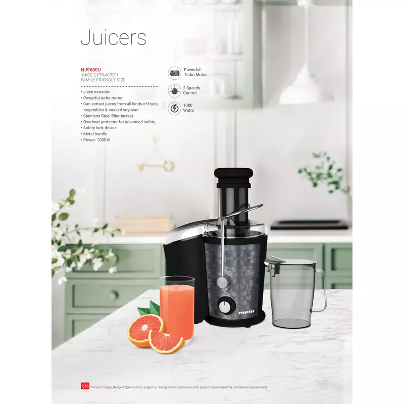 Nikai Juicer Extractor Metal Handle 800W NJ9600 2 Speed With Pulse Function With Steel Filter Basket Overheat Protector Powerful Turo Motor
