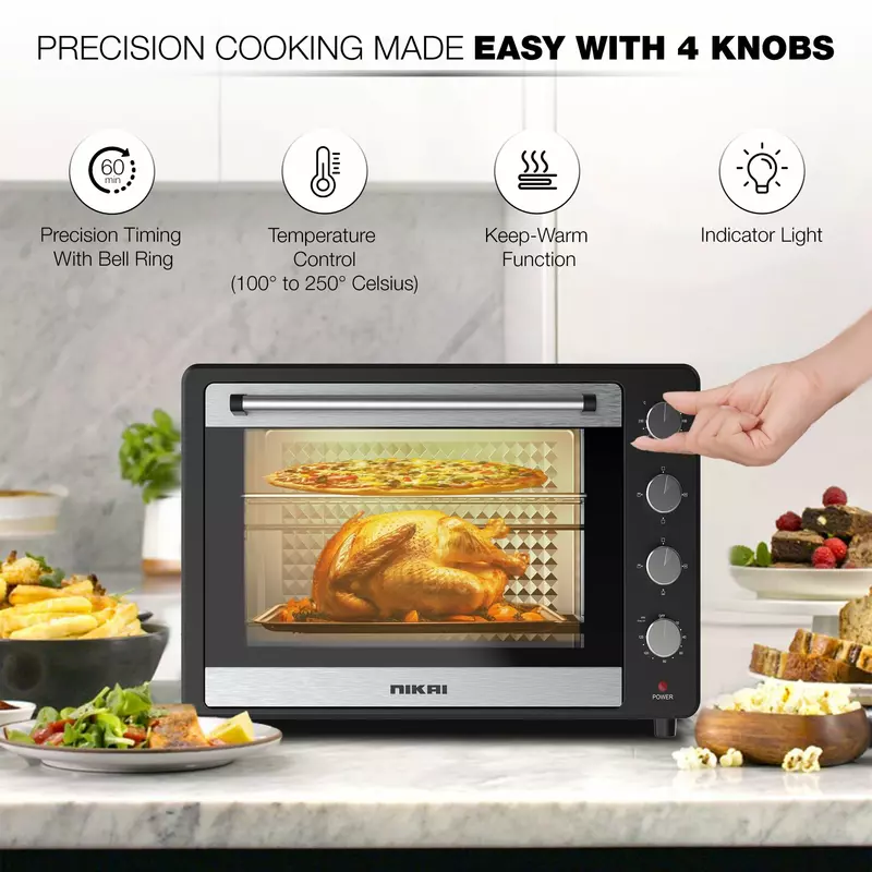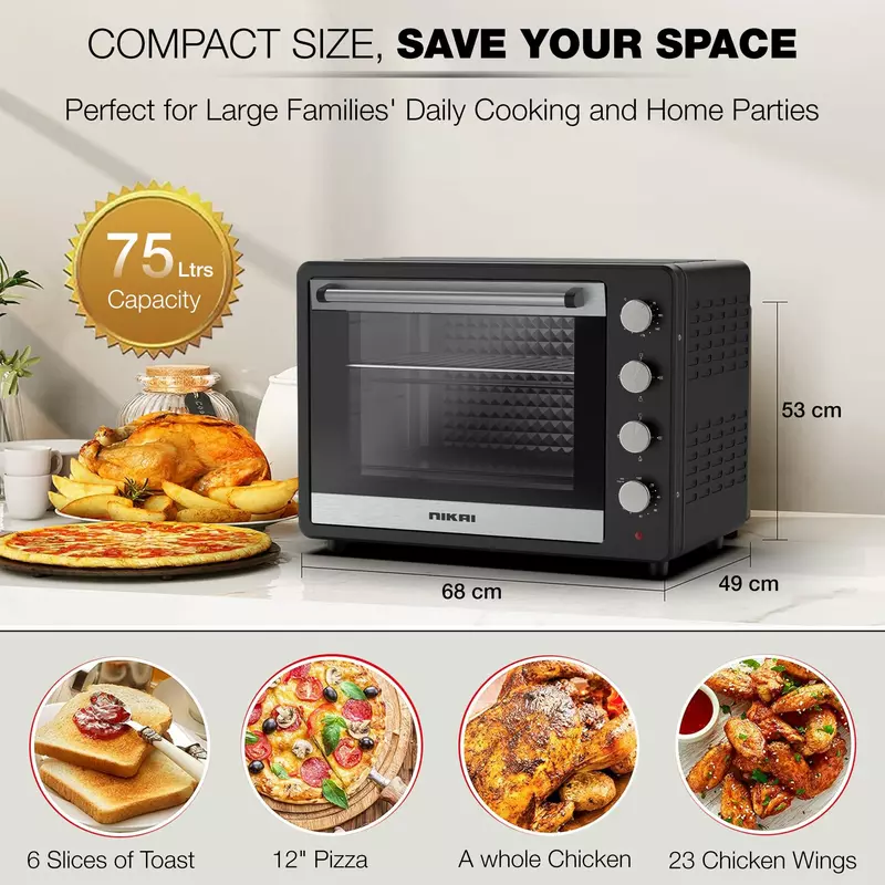 Nikai Oven Electric 75L With Rosting Function 4 Knobs Control 2200W NT75RCZ 120 Mins Timer Convection Function Single Inner Light Glass Panel