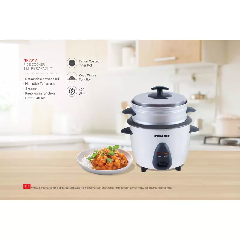 Nikai Rice Cooker 1L Keep Warm Function Teflon Coated Inner Pot 400w NR701A Aluminum Steamer Detachable Power Cord Indicator Lights