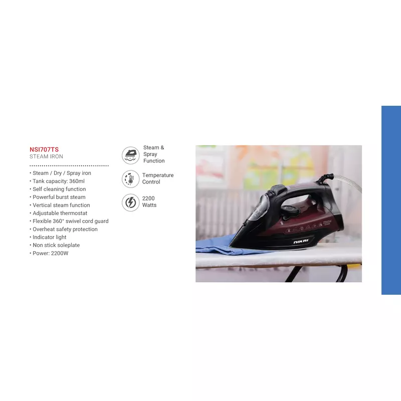 Nikai Steam Iron 360ml Tank Dry and Spray Function 2200w NSI707TS Temperature Control Non Stick Sole Plate Vertical Steam Function Indicator Light Powerful Burst System