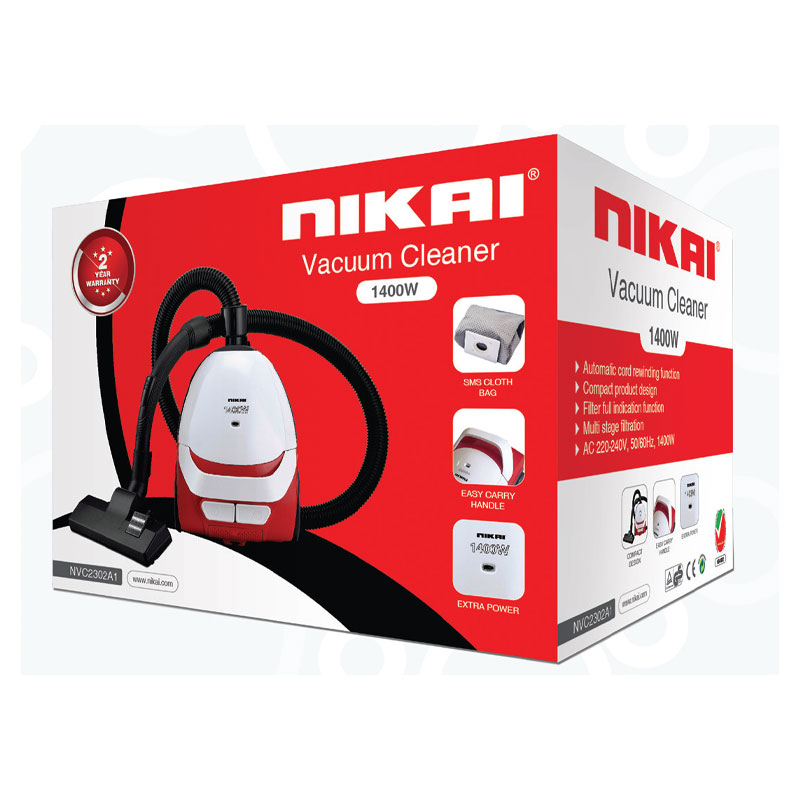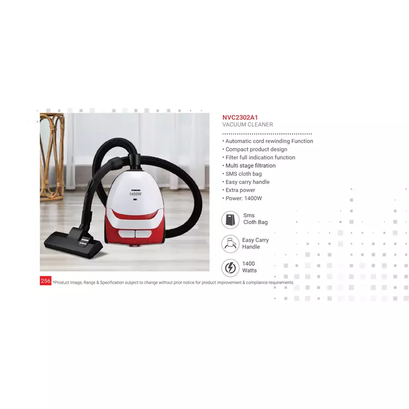 Nikai Vacuum Cleaner 1.2l Carry Handle with Cloth Bag 1400w NVC2302A1 Multi Stage Filtration Rewinding Function Filter Full Indication Function Easy Carry Handle