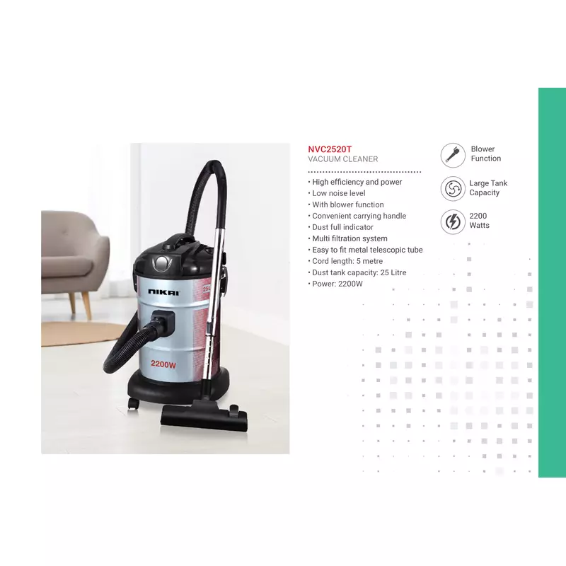 Nikai Vacuum Cleaner 25L Drum With Blower Function 2200W NVC2520T Metal Telescopic Tube High Efficiency And Power Dust Full Indicator 5M Cord Length Multi Filtration System