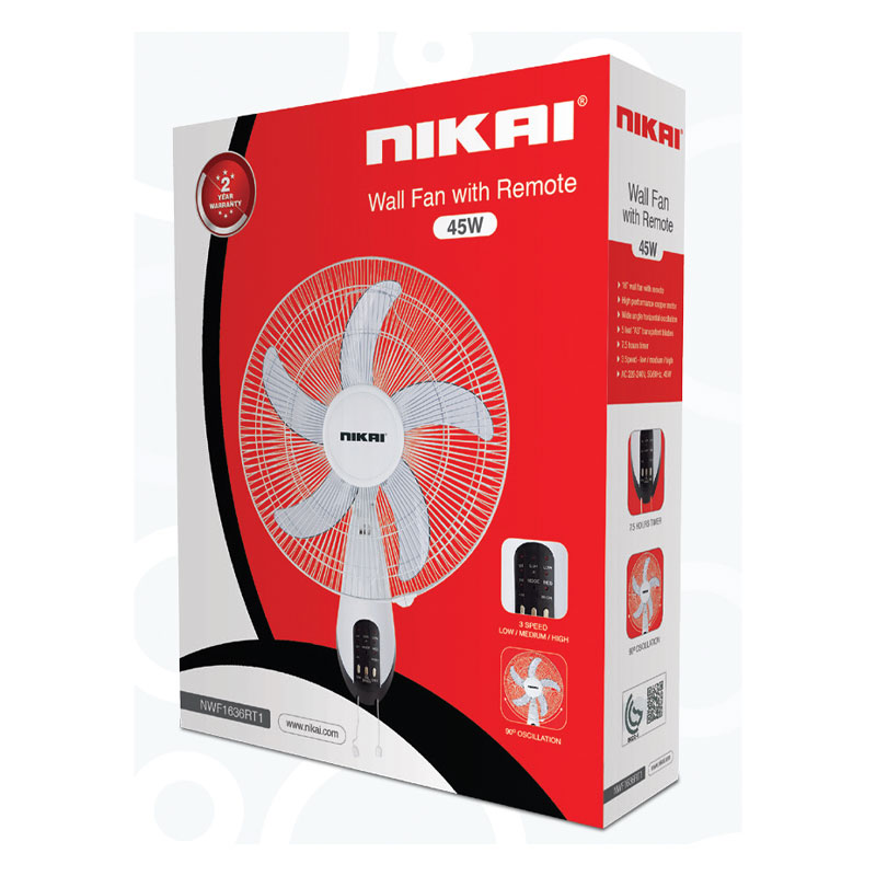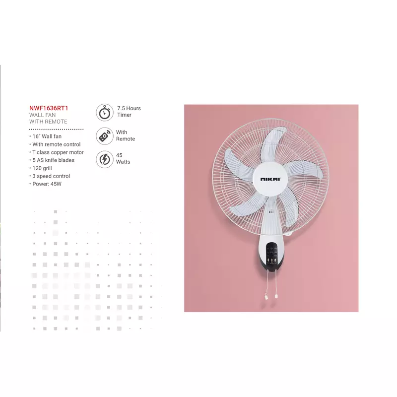 Nikai Wall Fan 16 Inch 5 Blades 3 Speeds 45W NWF1636RT1 T Class Copper Motor 120 Grill 5 As Knife Blades With Remote Control