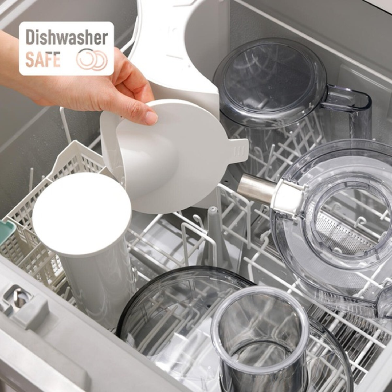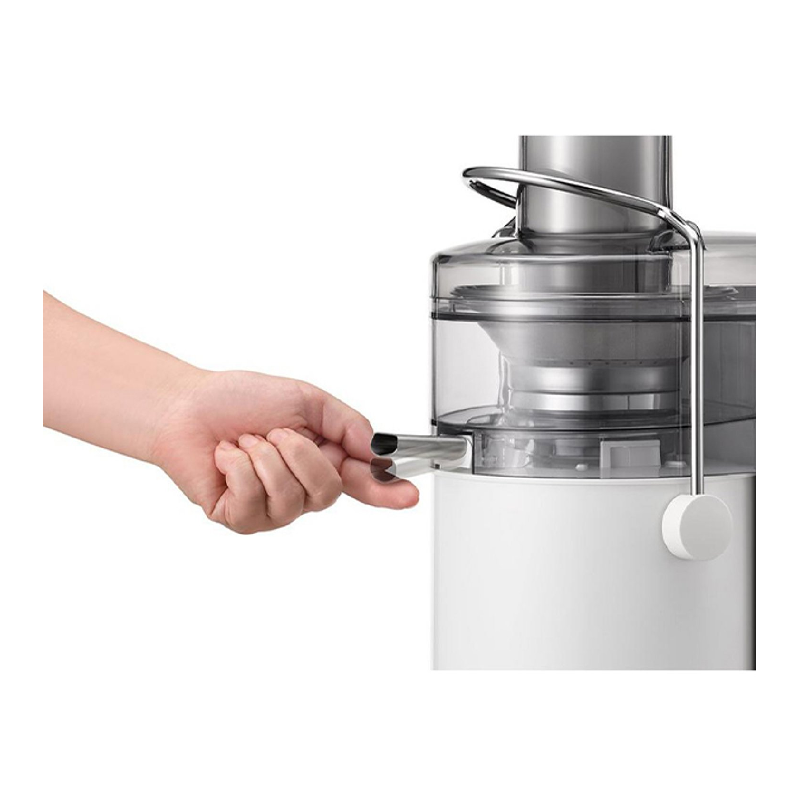 The juicer is very easy to clean, as there are fewer parts to wash and it is dishwasher-safe. The juicer lid is slightly curved to prevent pulp from sticking to the top surface of the container.