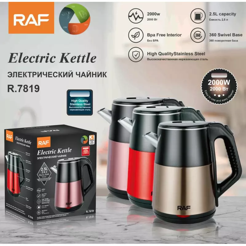 RAF Electric Cordless Kettle 2.5L 2000W, BPA Free Interior, 360° Swivel Base, Automatic Switch Off, High Quality Stainless Steel R.7819
