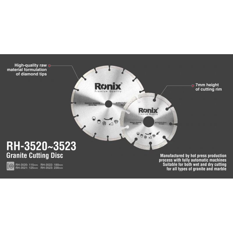 RH-3523 like the other Ronix granite cutting discs, above mentioned, it has a 230mm wheel diameter, 22.2mm arbor, 7mm segment, can be applied for cutting granites and marbles.