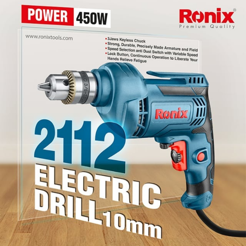 Ronix 2112 Electric Corded Drill, 450W, 220V, Keyed Chuck can do a wide variety of tasks, Able to drill holes in wood pieces, metal sheets and etc. this electric drill can become one of the most useful tools in your toolbox. Ronix 2112 is ideal for use in a workshop or on any job where you have access to an electrical outlet or power generator. The Ronix 2112 can help you power through a variety of tasks with ease, while also being sturdy enough to last for years in your toolbox. If you’re looking to add a corded drill to your arsenal of tools, this Ronix designed corded drill is a right choice.