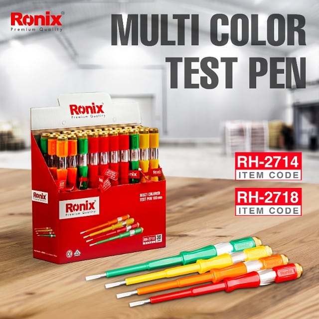 Handles These ergonomic, multi-color electrometric voltage light test pens are designed to deliver a technical proficiency according to the Ronix high standards. For gripping the tool easily and effortlessly we have designed a non-slip handle made from ABS environmental plastic. We have also insulated an ABS plastic cover on its handle so you wouldn’t need to worry about your safety while doing electronic operations. The light placed in its handle is made of high-quality xenon so it will keep its visibility even in intense light! A copper cap is also placed after the lightbox to improve the efficiency of the test pen. RH-2714 / RH-2718 are two great products with the dimension of 140mm and 180mm. They both meet the BS, EN and ASDN standards and that will leave no rooms for any doubts. Just take your multi-color test pen RH-2714 / RH-2718 in a display color box, select your favorite color and enjoy your colorful electrometric light test pen and screwdriver all at once!