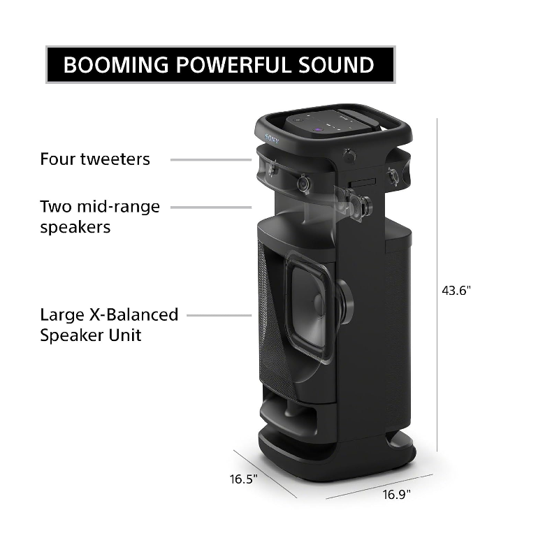 360° party sound carries powerful sound to every corner of the room. Four tweeters deliver clear sound to both the front and rear of the speaker, with two mid-range speakers for vocal clarity. The large X-Balanced Speaker Unit power the bass sound.