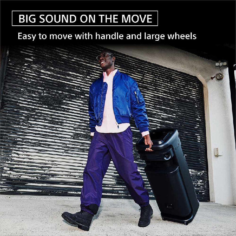 Grab the handle, tilt the speaker back, and roll it to your desired location with ease. Its sturdy, large wheels ensure smooth transportation straight to the party.