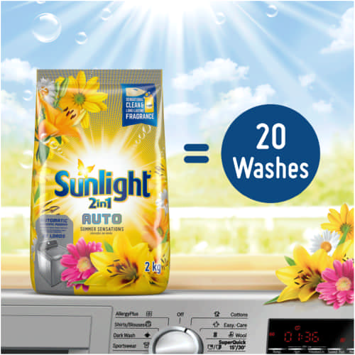 The freshness and fragrance of Sunlight 2in1 Automatic Washing Powder will put a spring in your step and a smile on your face.