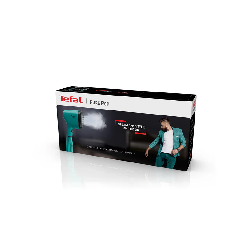 Steam your style, your way. Steam in style on the go with Tefal Pure POP, a range of handheld garment steamers available in a choice of four eye-popping colours*. In teal green with a contemporary slim silhouette, this standout steamer looks sharp – and it’ll make sure you do, too. Light and compact, this little clothes steamer is made for travel. It even has its own pouch. So, you can ensure you’re dressed to impress, wherever you are. Pop it in your bag and you’re good to go – on holiday, on business, or even to the gym. Portable, but punchy, this 1300W Tefal steamer blasts out 20g of steam a minute to show creases who’s boss. Just hang up your clothes and steam away. If you want to go old school, you can use it horizontally to tackle tough areas, like the collar and cuffs. No leaks, no ironing board, no hassle. With its nifty reversible pad system, this handheld steamer is ready for anything. Delicates? Use the gentle velvet side to steam without risk of damage. Dog hair? Switch to the lint removal side and get that outfit looking as good as new. Pure POP is ready to steam in a lightning-fast 15 seconds – because time is precious. Better still, this steamer does two jobs at once, smoothing and sanitising in one stroke. The purifying steam refreshes clothes, reduces odours, and kills up to 99.9% of viruses, bacteria and germs**. All of which means more wearing and less washing. Pure POP is repairable by Tefal for 15 years. Nice one.