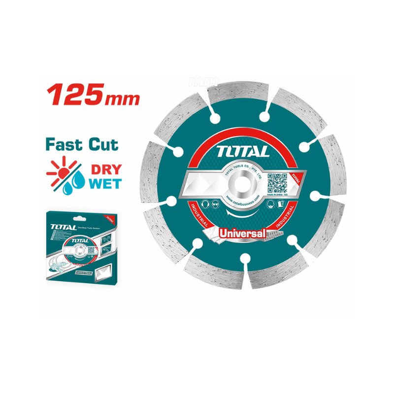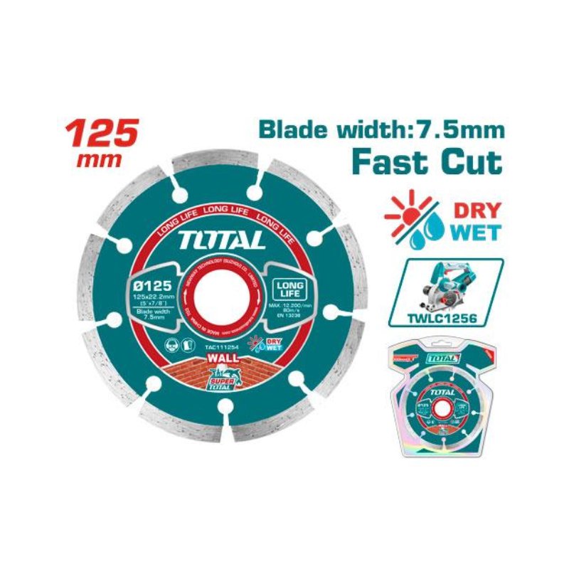 Cutting disc Total TAC111254 has dimensions 125 mm with a blade width of 7.5 mm. This disk is coated with high-strength diamond spraying, which allows dry, cutting of concrete, stone, ceramics and other similar materials. The diameter of the landing hole is 22.2mm. Made of high quality artificial alloy with high anti-corrosion properties.