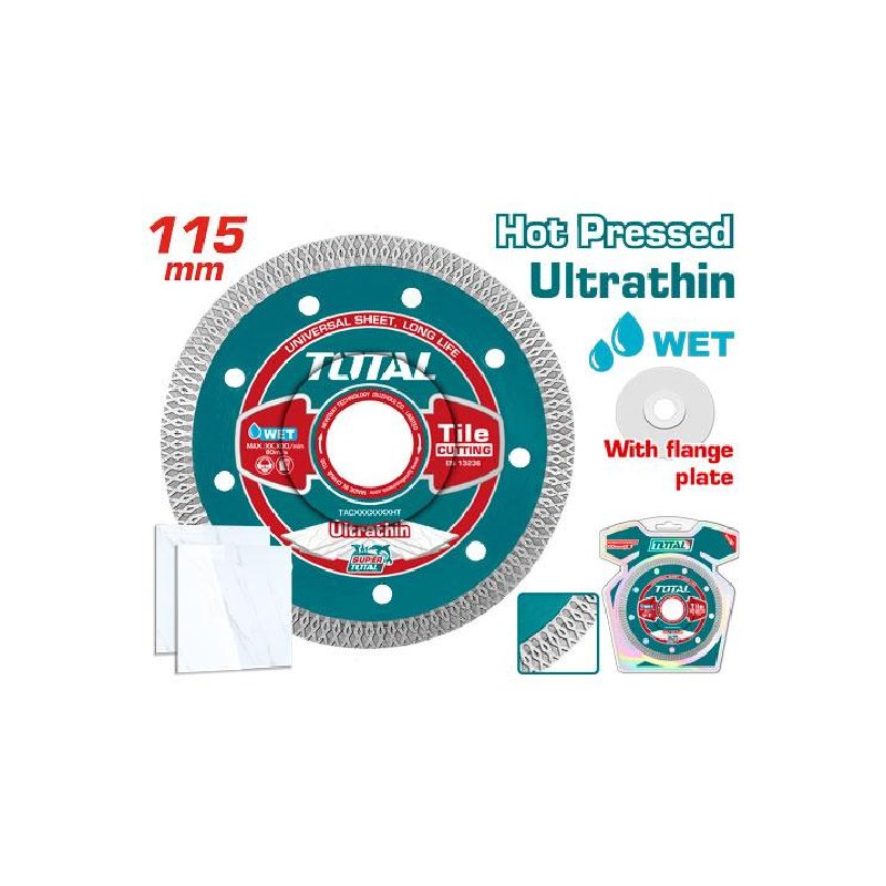 Diamond disc ultra thin TOTAL TAC2181151HT is made of high quality alloy. intended for use on hand-held angle grinders when cutting concrete, granite, marble, brick, ceramic tiles and other hard building materials. The reduced blade thickness doubles the cutting speed. High strength diamond segments for efficient cutting.