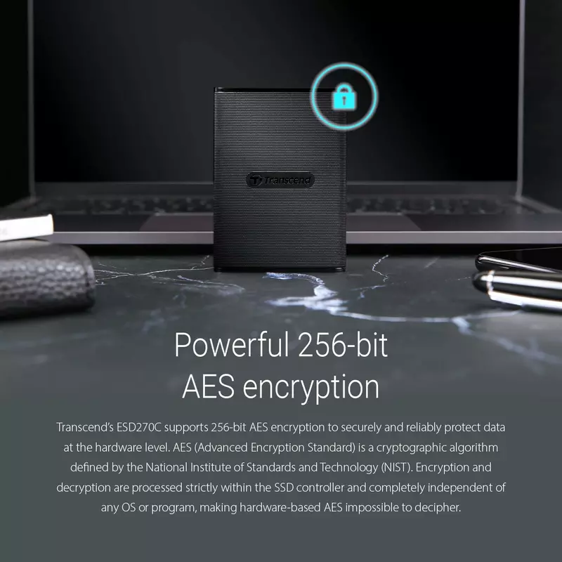 Transcend’s ESD270C supports 256-bit AES encryption to securely and reliably protect data at the hardware level. AES (Advanced Encryption Standard) is a cryptographic algorithm defined by the National Institute of Standards and Technology (NIST). Encryption and decryption are processed strictly within the SSD controller and completely independent of any OS or program, making hardware-based AES impossible to decipher.