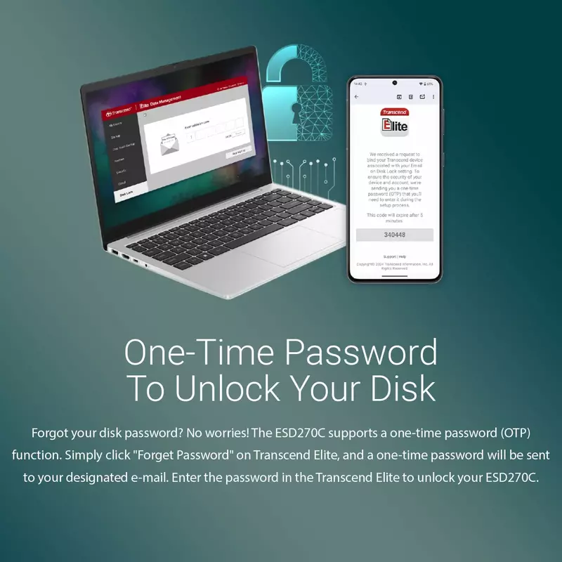 Forgot your disk password? No worries! The ESD270C supports a one-time password (OTP) function. Simply click “Forget Password” on Transcend Elite, and a one-time password will be sent to your designated e-mail. Enter the password in the Transcend Elite to unlock your ESD270C.