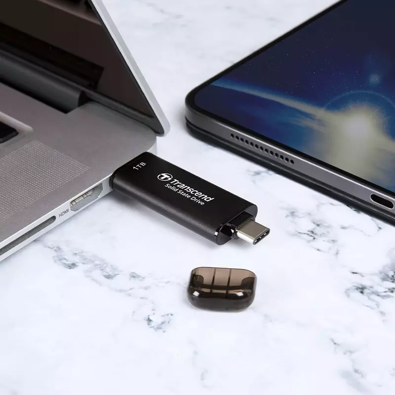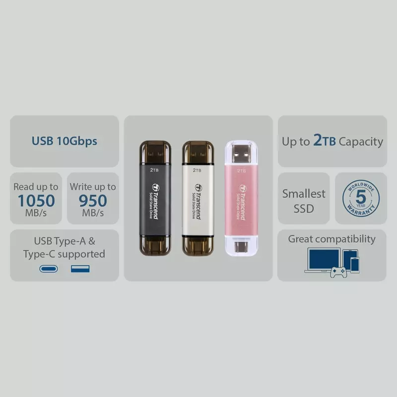 The ESD310 is Transcend’s smallest portable SSD that delivers a lightning-fast transfer rate of 10 Gbps and a capacious storage capacity of up to 2TB, allowing you to transfer vast amounts of files in the blink of an eye. With the inclusion of both USB Type-A and Type-C connectors in a single drive, the ESD310 is a convenient and efficient external storage option that you won’t want to miss out on!