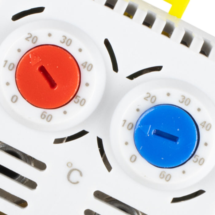 Thermostat (contact breaker, normally closed) for regulating heaters. The contact opens when temperature is rising. Thermostat (contact maker, normally open) for regulating filter fans and heat exchanges or switching signal devices when temperature limit has been exceeded. The contact closes when temperature is rising. Heaters and cooling equipment can be switched independently from each other with a temperature offset as opposed to the usual change-over contacts.