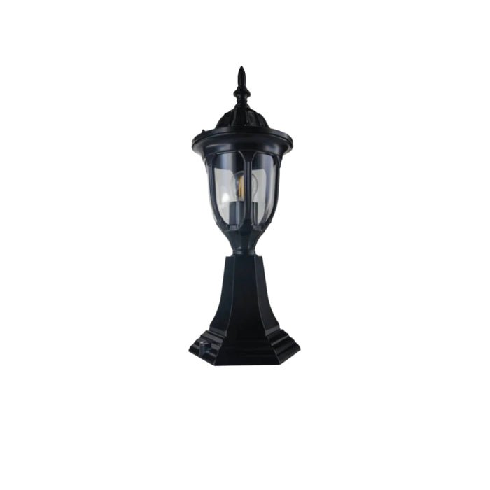 Black outdoor gate lantern with clear glass makes this light durable, reliable and waterproof combination you need in your security lights for long-lasting reliable usage.