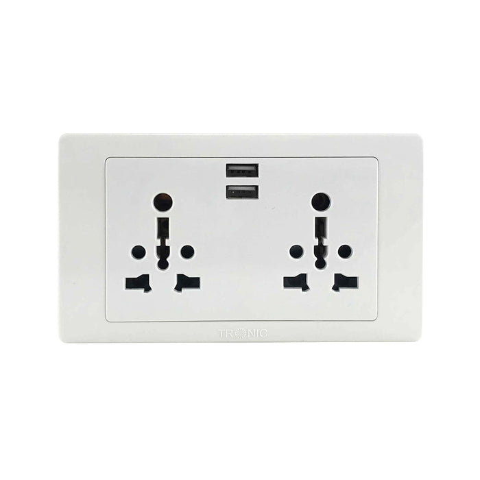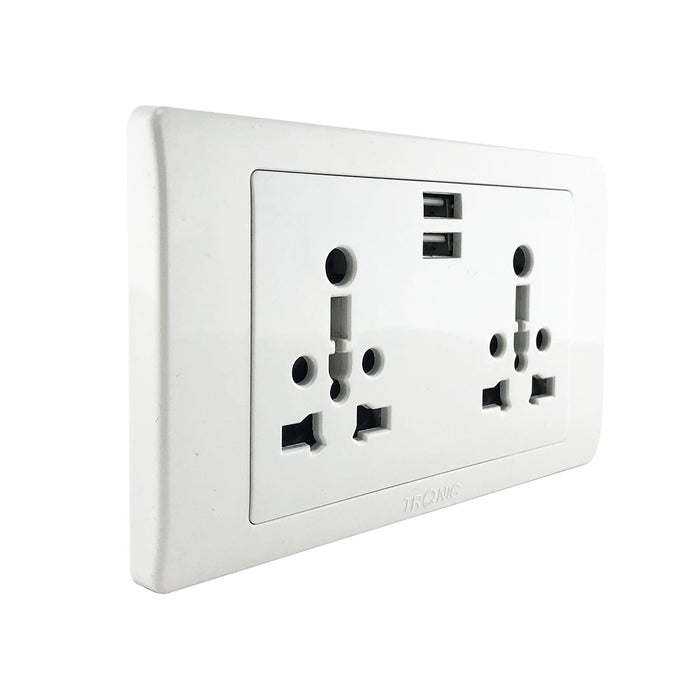 This standard range Tronic Universal Double Socket in white has smooth edges, has a neon indicator, and has a shiny surface to fit any style of ones home or office. Its screws are visible suited to make it easier to do maintenance should it be necessary whilst also providing a safe and durable socket for your appliances. A universal single socket can handle both 15A and 13A plugs, i.e., square and round ports. This socket also has 2 USB ports to charge your mobile devices.