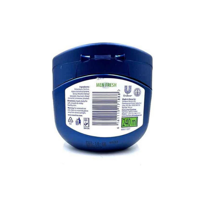 Vaseline men fresh moisturizing petroleum jelly lives up to its name, leaving skin feeling fresh and invigorated after every application. Vaseline Men Petroleum Jelly FRESH 240 ml, Vaseline MEN Fresh BLUE SEAL Petroleum Jelly is a specially formulated jelly designed specifically for men’s unique skincare needs. This variant will help to moisturise dry skin, leaving it feeling fresh, hydrated and protected. Trusted to protect your family’s skin for 150 years. With properties that help accelerate your skin’s natural healing process, the Original Vaseline® Healing Jelly protects and restores your skin and gives it the extra care it needs.