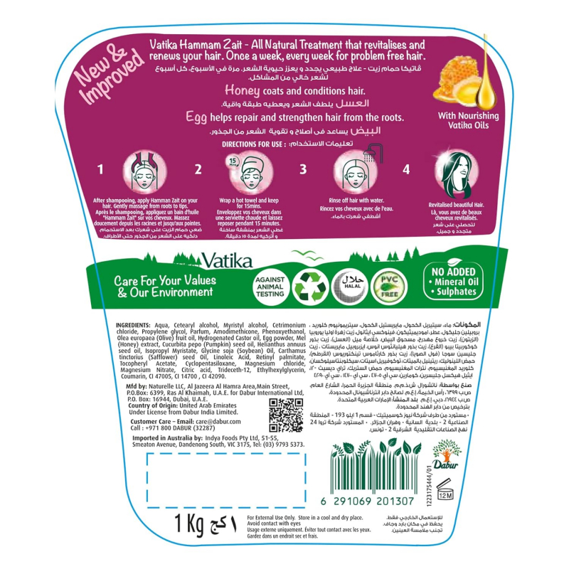 Vatika Intensive Nourishment Hammam Zaith is formulated for damaged, weak and falling hair. It contains Honey, Egg, Castor and Marrow to make hair strong from the roots.